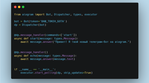 В этой статье мы рассмотрим, как написать эхо-бота на Python с использованием библиотеки aiogram. Перед написанием кода нужно установить библиотеку aiogram. Для этого нужно перейти в командную строку/терминал и прописать pip install aiogram. Получение токена для телеграм-бота Для начала нам нужно получить токен. Переходим в бота @BotFather. Отправляем ему команду /newbot. После этого бот попросит отправить ему название для нового телеграм-бота. Далее останется отправить имя бота, и токен будет у нас...