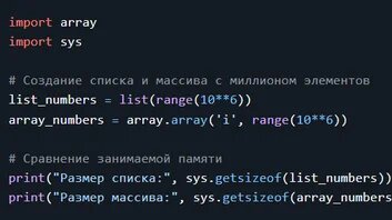 array.array — это специализированный тип данных в Python, предназначенный для хранения последовательностей однотипных чисел. В отличие от list, массивы array.array обеспечивают более эффективное использование памяти и повышенную производительность при работе с числовыми данными. При обработке больших объёмов числовых данных array.array позволяет значительно экономить память, поскольку хранит элементы в компактном виде. В отличие от list, который использует объекты Python для хранения значений, array...