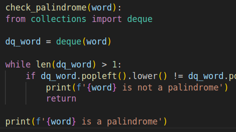 Двусторонняя очередь (deque) — это структура данных, позволяющая добавлять и удалять элементы с обоих концов очереди с одинаковой эффективностью. В Python deque реализуется в модуле collections. В этом примере мы рассмотрим, как использовать deque для проверки, является ли слово палиндромом. Палиндром — это слово или фраза, которые читаются одинаково слева направо и справа налево, игнорируя пробелы, регистр и знаки препинания. Примеры палиндромов: "deed", "noon", "level". Мы будем использовать двустороннюю очередь для проверки, является ли слово палиндромом...