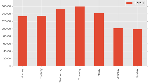 plt.rcParams['figure.figsize'] = (10, 5) Вернемся к нашему набору данных о велосипедистах. Допустим, я живу в Монреале, и мне любопытно, используется ли велосипед для пригородных поездок, или для развлечения - люди больше катаются на велосипеде в выходные дни или в будние? Добавляем столбец "день недели" Загрузим данные In [2]: bikes = pd...
