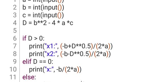 Не так давно я начал изучать язык программирования Python и мне стало интересно написать собственный код для решения квадратных уравнений. Для начала нам нужно задать три переменных a, b и c в которые мы будем записывать коэффициенты уравнения. Затем задаем переменную D в которой будем записывать итог вычисления дискриминанта. Далее мы создаем условную структуру из if, elif и else. Если наш дискриминант больше нуля, то мы вычисляем два его корня. Если же он равен нулю, то мы вычисляем один корень...