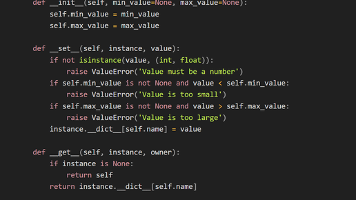instance.__dict__ - это словарь, который содержит все атрибуты экземпляра класса в виде пар ключ-значение. То есть, если у вас есть экземпляр класса obj и атрибут x, то obj.__dict__['x'] вернет значение этого атрибута. В первом примере использовалось выражение instance.__dict__[self.name], чтобы установить значение атрибута, на котором определен дескриптор. Это нужно было для того, чтобы избежать рекурсивного вызова метода __set__() дескриптора. Если бы мы написали instance.x = value, то это привело бы к вызову метода __set__() дескриптора, что могло бы привести к бесконечной рекурсии...