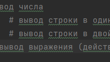 Для вывод данных (информации) в консоль (на экран) используется функция (команда) print. На экран можно вывести число, строку, выражение. Можно выводить сразу несколько. Все значения по умолчанию выводятся через пробел. Это можно изменить с помощью параметра функции "sep". По умолчанию стоит пробел. Каждая команда print будет выводить в новой строке. Это можно изменить через параметр "end". По умолчанию стоит "\n" \n - управляющий символ перевода строки - программный Enter. Вывод значений переменных...