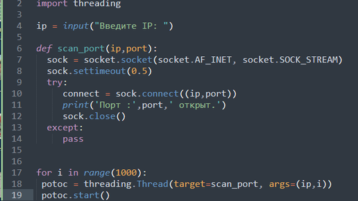 Всем привет! В этой статье напишем простой сканер открытых портов. 1. Создадим папку, а в ней файл scan с расширение .py (eng) 2. Откроем его с помощью текстового редактора. (у меня sublime text) и импортируем сразу 2 библиотеки: socket и threading 3. Попросим пользователя ввести IP адрес для сканирования и передадим значение переменной ip 4. Напишем функцию сканирования портов. Socket будет использоваться для подключения к порту. 5. Вызовем функцию scan_port в цикле с указанным пользователем IP адресом для сканирования на нем портов: 6...