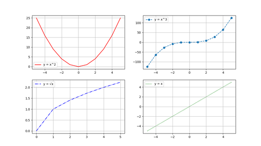 py -m pip install -U matplotlib Построим 4 графика. Прямую y = x Параболу y = x^2 Кубическую параболу y = x^3 Ветвь параболы y = √x Импортируем библиотеку matplotlib, а также numpy, она нужна для вычисления корня, также можно использовать библиотеку math. import matplotlib.pyplot as plt import numpy as np Далее имеем такой код. x это список точек от -5, до 6 с шагом 1. После этого находим список точек y для каждой функции с помощью цикла for...