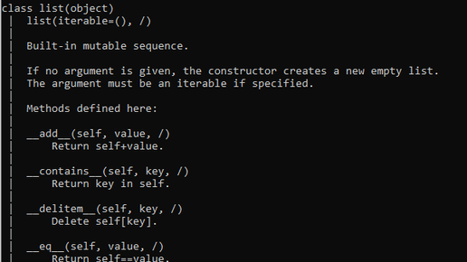 В Python есть возможность читать встроенную в код документацию с помощью двух инструментов, а также писать собственную. Рассмотрим, как это можно делать: Получаем документацию с помощью метода help() Вызов метода help(), возвращает полную справку о переданной функции/объекте. Синтаксис: print(help(<объект справки>) Например: Справка вернула полную информацию о List-e, включая методы его исходного кода(их намного больше, так как все перечислять слишком долго). Это работает со всеми стандартными функциями и объектами...