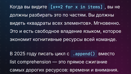Многие думают, что если код работает — трогать его не надо. Опасная философия, особенно в мире IT, который меняется, пока вы допиваете свой утренний кофе. В Python есть очень четкий маркер, который моментально отделяет современного разработчика от того, кто мысленно застрял в 2015 году. Имя этому маркеру — синтаксический сахар. Я подготовил 5 карточек с ключевыми тезисами. Пролистайте их, а потом мы разберем каждый пункт подробно, с примерами и доказательствами. Пролистали? Отлично. А теперь — к мясу...