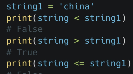 Для сравнения строк в Python используются не только == и !=. Как и при сравнении чисел, мы можем использовать операторы <, >, <= и >=. Мы присваиваем значение «chinese» для string и «china» для string1. Теперь сравним эти две строки с помощью операторов сравнения <, >, <=, >=. После сравнения string и string1 оператором < мы получаем False...