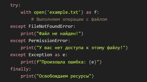 Общее Механизм исключений в Python используется для обработки ошибок и исключительных ситуаций, которые могут возникнуть во время выполнения программы. Когда происходит исключительная ситуация, Python создает объект исключения, который содержит информацию об ошибке, и передает его обработчику исключений. Механизм исключений в Python использует ключевые слова try, except, else и finally. Конструкция try-except позволяет обработать исключительную ситуацию. Она имеет следующий синтаксис: В этой конструкции блок try содержит код, который может вызвать исключительную ситуацию...