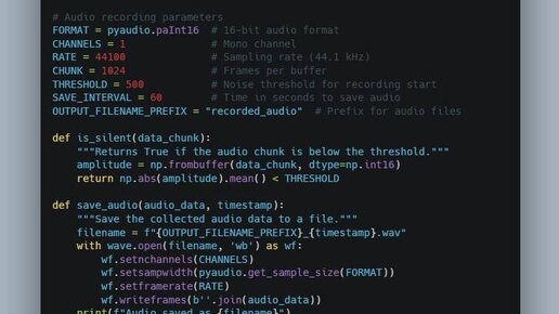 Обнаружение шума в реальном времени и аудиорекордер на Python Создайте систему обнаружения шума и записи звука в реальном времени с помощью Python. Этот код непрерывно прослушивает звук, записывает аудио фрагментами и сохраняет файлы через определенные промежутки времени...