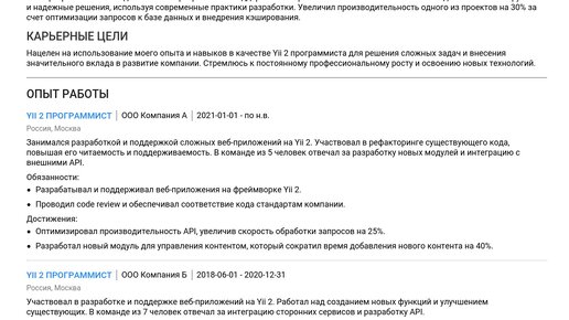 Пример резюме программиста Yii 2 2025 - Как составить