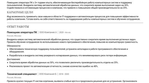 Ищете пример резюме помощника оператора ПК, который поможет выделиться среди других кандидатов? Изучение готовых примеров – лучший способ понять, как составить действительно эффективное резюме и быстро получить приглашение на собеседование. На этой странице мы собрали не просто пример резюме помощника оператора ПК, а подробное руководство по его созданию с учетом актуальных требований работодателей. Здесь вы найдете: Изучив пример, вы сможете создать резюме с помощью нашего конструктора резюме. Заголовок резюме должен четко отражать вашу специализацию и быть понятным для работодателя...