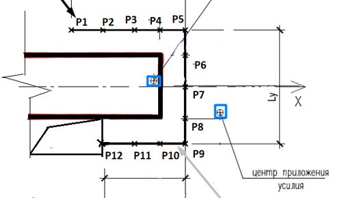 Алгоритм расчета: Шаг 1. Определение характеристик расчетного контура, реакций в плите. В случае определения поперечного усилия через дельту сжимающих усилий вертикального элемента над и под плитой, следует учесть, что разность усилий на противоположных краях вертикального элемента не может превышать в 1,5 раза усилия в центре; Шаг 2. Определение центра тяжести расчетного контура Шаг 3. Определение равнодействующей центра приложения равнодействующей усилий Шаг 4. Определение момента из плоскости...