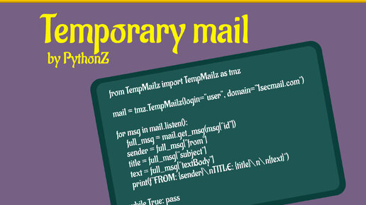 На связи канал PythonZ, и сегодня мы вам покажем наш модуль, который позволит без ограничений взаимодействовать с временной почтой. Python - язык программирования, который подходит почти для любых целей. Одна из них - автоматизация. Наша библиотека как раз создана для автоматизации некоторых задач. Установка Для установки модуля, достаточно ввести в консоль: python3 -m pip install TempMailz После этого вы сможете использовать библиотеку в вашем проекте. Использование Допустим, у нас есть цель создать 10 случайных временных почтовых адресов, которые будут в реальном времени принимать сообщения...