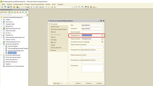 Доброго времени суток. На этом занятии мы дополним функционал по обработке и создадим регистр сведений, который будет хранить информацию о курсах на определенную дату. Создадим регистр и назовем его "КурсыВалют" (Рисунок 1). Установим свойство "Периодичность" в пределах дня (Рисунок 2). Перейдем на вкладку "Данные" и зададим его структуру (Рисунок 3). При задании реквизитов для данного регистра типы данных нужно оставить такие же, какие создавались для самой обработки. Откроем обработку и допишем код загрузки валют (Рисунок 4)...