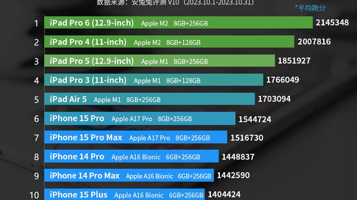 Команда популярного бенчмарка AnTuTu опубликовала свежий ежемесячный рейтинг самых производительных мобильных устройств Apple. По итогам ноября тройке лидеров продолжают царить различные версии iPad Pro. При этом смартфоны новой линейки iPhone 15 по части производительности показывают себя неплохо, хоть и не фантастически. iPhone 15 Pro занял шестое место и сейчас является самым производительным среди смартфонов Apple, на седьмом месте находится iPhone 15 Pro Max...