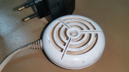 В старой бане мне попалась в руки вот такая интересная вещица. Вообще меня интересует все, что устроено сложнее молотка и по возможности включается в электрическую розетку. Небольшой блок питания, провод длиной около метра, небольшой диск размером с кофейное блюдце. На диске имеются отверстия, внутри установлена мембрана. После нехитрых умозаключений стало понятно, что диск это излучатель. Под воздействием электрического тока, который трансформирует блок питания, мембрана должна колебаться и вырабатывать звуковые волны, то есть издавать звук...