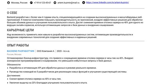 Ищете пример резюме backend developer? Изучение готовых примеров — лучший способ понять, как составить эффективное резюме, которое поможет получить работу мечты. В нашем руководстве вы найдете все необходимое, чтобы составить идеальное резюме backend developer 🚀. Мы предоставили: Материал будет полезен как начинающим, так и опытным специалистам. Изучив пример, вы сможете создать резюме с помощью нашего конструктора резюме ✨. Заголовок резюме должен четко отражать вашу специализацию и уровень профессионализма...