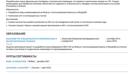 Пример резюме backend-разработчика (Node.js) 2025 - Как составить