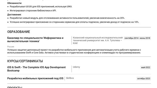 Пример резюме IOS-разработчика (Swift) 2025 с советами