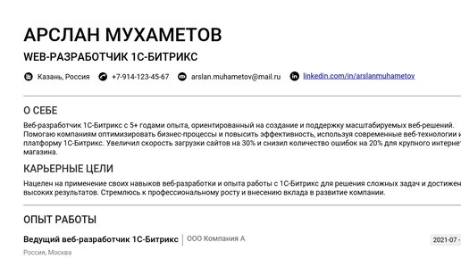 Пример резюме web-разработчика (1С-Битрикс) 2025 - готовые примеры