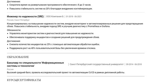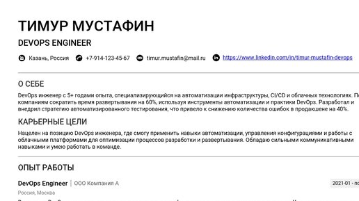 Пример резюме DevOps инженера покажет вам, как составить идеальную самопрезентацию для работодателя. Изучение готовых примеров — ваш ключ к созданию эффективного резюме, которое поможет быстро получить работу мечты. В этой статье вы найдете все, что нужно для составления сильного резюме DevOps инженера. Мы собрали: , а также актуальные требования работодателей и советы по адаптации вашего CV. Это руководство полезно как новичкам, так и опытным профессионалам. Изучив пример, вы сможете создать резюме с помощью нашего конструктора резюме...