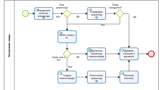 Организация работы склада. Описание. BPMN схемы прилагаются Штрих-код был изобретен в 1951 году и, казалось бы, уже прочно вошел в нашу жизнь, однако, как показывает моя практика, многие пользователи не знают, что это такое, даже многие IT-специалисты не знают, что такое сканер штрих-кодов и терминал сбора данных. И кажется, что все это сложно для понимания и внедрения, но на самом деле это достаточно просто. И одна из целей данной статьи — показать, насколько проста работа при штрих-кодировании, прояснить логику и последовательность операций на автоматизированном складе...