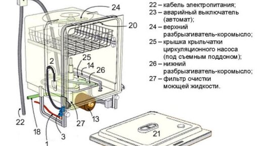 Посудомоечная машина - это ли не чудо техники, экономия времени и воды! Да и попробуй так чисто отмой посуду, как с этим справляется посудомойка. У старых моделей, конечно, были проблемы с отмыванием присохшей пищи, и перед тем как поставить мыться посуду, нужно было замочить её и сполоснуть, по факту проще тогда намыть её самостоятельно)))) Но современные посудомойки легко справляются и с засохшей едой на тарелках. Итак, для начала, для общего развития, я покажу схему основных узлов и из чего состоит посудомоечная машина...