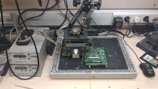 Ноутбук принесли в ремонт с жалобой на то, что не устанавливается видеодрайвер. Вроде как все работает и проблем с изображением нет, но вот драйвер видеокарты выдает ошибку и не работает. Ну и соответственно игрушки тоже не запускаются ссылаясь на то что видеодрайвер работает некорректно. Вариантов тут нет - вышел из строя видеочип, придется его менять. Разбираем ноут, на инфракрасной паяльной станции снимаем нерабочий видеочип, ставим новый, частично собираем ноут, проверяем - картинка есть, теперь нужно собирать ноут и тестировать новый видеочип...