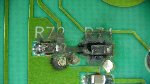 Инструкция по ремонту. Самой стиралки в наличии не имею, принесли только модуль на ремонт. Визуально видны два сгоревших в уголь smd резистора под обозначением R71 R72. Это резисторы делителя напряжения от таходатчика оборотов мотора. Их номинал 13 кОм. Естественно, такие высокоомные резисторы не могут сгореть от сигнала низковольтного датчика. Явно прилетело высокое напряжение с мотора на таходатчик, вероятнее всего через воду. Проверять нужно всю схему обработки сигнала таходатчика, особенно транзистор T7 и диод D9 на другой стороне платы...