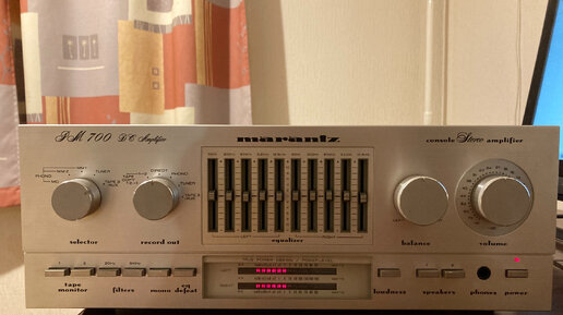 Marantz PM700DC - полный усилитель, выпускался с 1980 года и до 1982-го. Поэтому, наверное, на вторичном рынке встречается не часто. Мне попался в первый раз. Имеет переключатель сетевого напряжения и может питаться от нашей сети 230 В. Ручки, движки эквалайзера, кнопки - все металлическое. Корпус хоть и из тонкой стали, но с ребрами жесткости внутри. Аппарат в сборе имеет приличную прочность и жесткость. Дизайн достаточно броский, благодаря светодиодным индикаторам выходной мощности и эквалайзеру в центре лицевой панели...