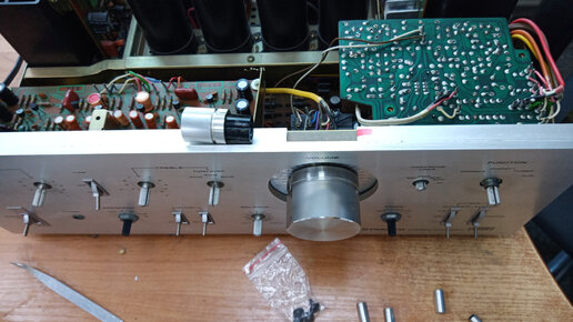 В первой части статьи я описал процесс разборки усилителя. Честно говоря, взялся за это дело надеясь на то, что неисправность примитивная - аппарат щелкал, пропадал канал. По схеме и внешнему виду модель 8800II идентична 8500II. Первая мысль - "убитый селектор каналов" , оказалась правильной. Но... Но по порядку. Промыть на плате деталь нереально. Снять селектор не так просто. Надо снять переднюю панель, снять блок эквалайзера (фонокорректора), удалить припой с десятка контактов и т.п. Откручиваем винтики и осторожно разбираем...