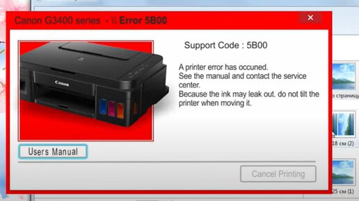 В данной статье мы рассмотрим четыре способа решения ошибки 5b00 на струйном принтере Canon G3400. Как идентифици́ровать эту проблему? При отправке документа на печать аппарат выдаст соответствующую ошибку. На принтере будет постоянно гореть синий индикатор, а зеленый и оранжевый будут мигать. Способ 1 Включаем МФУ кнопкой включения и выключения электропитания и ждем, пока погаснут все индикаторы. После этого зажимаем кнопку Stop/Cancel, не отпуская нажимаем на кнопку включения и, не отпуская кнопку включения, 5 раз нажимаем и отпускаем кнопку Stop/Cancel...
