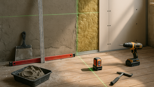 M (материал): R (результат): ровность, акустика, скорость, полезная площадь. 5F (5 факторов): влажность → кривизна → коммуникации → сроки → отделка. F (fix): грунты, ленты, гидроизоляция, двойной лист на шум. R (risk): трещины (мокро), «барабаны»/вмятины (сухо), промах по влажным зонам. Нет «лучше вообще», есть «лучше здесь». Малые кривизны и тяжёлые крепления — за штукатуркой; большие перепады, скрытые коммуникации и скорость — за ГКЛ...