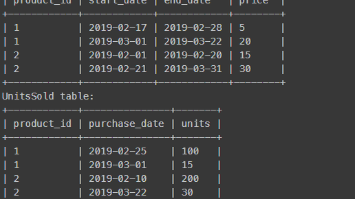 Задача: Напишите SQL-запрос, чтобы найти среднюю цену продажи для каждого продукта. average_price должна быть округлена до 2 знаков после запятой. Дано: Таблица: Prices (product_id, start_date, end_date) является первичным ключом для этой таблицы. Каждая строка этой таблицы указывает цену product_id за период от start_date до end_date. Для каждого product_id не будет двух перекрывающихся периодов. Это означает, что не будет двух пересекающихся периодов для одного и того же product_id. Таблица: UnitsSold Для этой таблицы нет первичного ключа, она может содержать дубликаты...