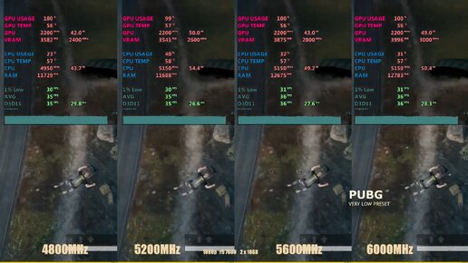 На YouTube-канале Odin Hardware проверили в современных играх в Full HD производительность Ryzen 7600 с 2×16 ГБ 4800 МГц, 5200 МГц, 5600 МГц и 6000 МГц. COD Black OPS 3 запускалась с Low Details. Средний FPS в ней составил 32 к/с (4800 МГц), 32 к/с (5200 МГц), 33 к/с (5600 МГц), 32 к/с (6000 МГц). Игра Cyberpunk 2077 шла с Lowest Details. В среднем в ней удалось получить 10 к/с (4800 МГц и 5200 МГц) и 11 к/с (5600 МГц и 6000 МГц). GTA V тестировалась с Low Details. Средняя частота кадров в ней равнялась 48 к/с (4800 МГц), 50 к/с (5200 МГц), 53 к/с (5600 МГц), 48 к/с (6000 МГц)...