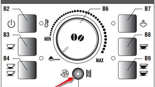 Производить удаление накипи кофемашины следует тогда, когда на панели управления загорится индикатор накипи. Для простоты весь процесс можно разделить на три этапа. Делаем и радуемся жизни. Исходное состояние: индикатор накипи постоянно горит. 1й этап - декальцификация 1.   Заливаем воду в бак до уровня В (все метки есть на стенках бака для воды). 2.   Добавляем 100мл антинакипина и устанавливаем бак в машину. 3.   Нажимаем и в течении 5 секунд удерживаем кнопку индикатора очистки накипи. 4.   Начнёт мигать кнопка «Пар»...