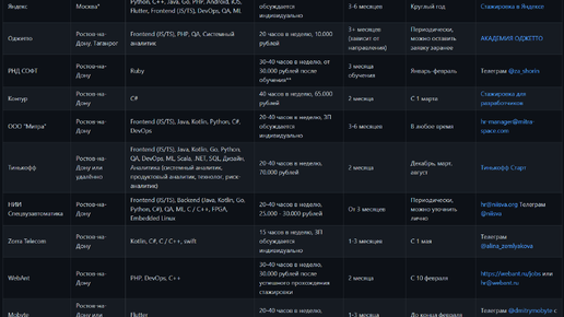 Собрали в одном месте (и регулярно обновляем) список компаний, которые проводят стажировки для студентов и начинающих в 2023 году в Ростове, Таганроге или удаленно. В списке можно найти стажировки по Java, С#, Kotlin, JS, Go, Python, С++, Swift, FPGA, PHP, Ruby, Flutter, QA, DevOps, ML, Scala, ...