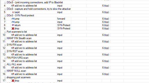 Когда-то нашёл на просторах интернета правила фаервола (firewall) роутера микротик для защиты от сканирования портов и ддос атаки. Спустя пользования долгого времени данные правила отлично себя показали. Не буду как говорится тянуть кота за ... =) Визуально правила выглядят так: Ниже на скриншоте видно, что правила прекрасно работают...