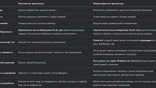 В этой статье разберемся с различия, плюсами и минусами, когда и почему выбирать тот или иной подход в архитектуре ПО. - Монолитная архитектура (Monolith) — это единое, неделимое приложение, где все компоненты (UI, бизнес-логика, слой данных) тесно связаны, скомпилированы и развернуты как один артефакт. - Микросервисная архитектура (Microservices) — это подход, при котором приложение разбивается на набор небольших, слабо связанных и независимо развертываемых сервисов. Каждый сервис отвечает за свою узкую бизнес-возможность и общается с другими по сети...
