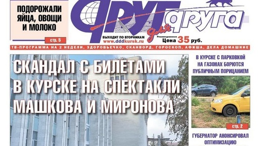 Во вторник, 21 октября, вышел в свет свежий номер всегда интересной семейной газеты «Друг для друга» — одного из самых популярных и читаемых печатных изданий Курской области. Из него вы можете узнать следующее. • 3-летний малыш погиб в страшной аварии под Курском. • Скандал с билетами в Курске на спектакли Машкова и Миронова. • В Курске с парковкой на газонах борются публичным порицанием. • Губернатор Хинштейн анонсировал оптимизацию правительства области. • Обвиняемые в хищении средств при строительстве фортификаций в Курской области вину не признали...