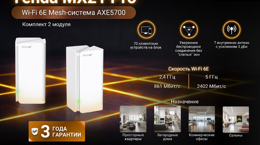 Tenda MX21 Pro — это система Mesh Wi-Fi, разработанная для предоставления высокоскоростного интернет-доступа в домах среднего и большого размера. Она создает распределенную сеть с несколькими узлами по всему дому благодаря технологии Tenda Mesh. Комплект из 2 устройств MX21 Pro способен покрыть площадь 240 кв. м. Tenda MX21 Pro поддерживает технологию Wi-Fi 6E с полосой пропускания 160 МГц. Суммарная трёхдиапазонная скорость беспроводной сети до 5665 Мбит/с, что позволяет полностью использовать возможности вашего высокоскоростного широкополосного интернета...