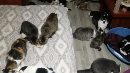 Когда нам звонит соискатель, он всегда спрашивает, каким кормом мы кормим своих пристраиваемых кошек. А кормим мы их кормом марки "ЗооРинг" для кошек. Консервы в виде паштета тоже покупаем этой же марки. Но котики такие существа, что, поев два дня марку "ЗооРинг", начинают нас шантажировать. Шантажируют умело! Значит, больше 20 котов открывают ротики и начинают вопить. Время суток шантажа начинается с 12 часов дня. Мы в это время работаем, а внизу и рядом горланящие котики. Выдержать это не каждый...