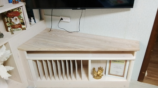Всем здрасьте. Продолжаю мастерить. На очереди изготовление тумбы под телевизор. По задумке на этой тумбе будет стоять проигрыватель винила, в горизонтальной низкой нише саундбар, а сбоку сабвуфер. Для хранения коллекции виниловых пластинок задумано специальное отделение снизу. Форма тумбы трапециевидная, высота 60 см. Такая вытянутая форма обусловлена углом поворота телевизора, чтоб его плоскость совпадала с краем тумбы. Кроме верхней крышки вся конструкция сделана из массива сосны. Основание...