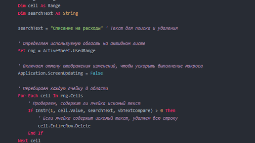 VBA удалить всю строку в Excel, если содержит искомый текст