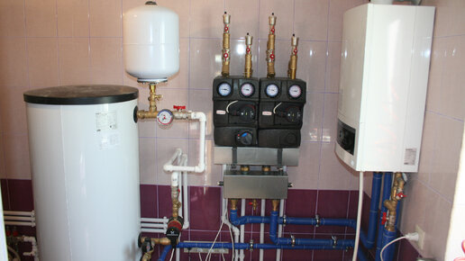 Типичная котельная для небольшого дома, которых я собрал достаточно большое количество. И вот, делюсь опытом, если меня читают коллеги, или просвещаю, если читают владельцы домов. Общий вид котельной, справа на стене висит газовый котёл Будерус U 072. Слева, круглая белая бочка, это бойлер того же производителя, в нём приготовляется горячая вода. В середине, гидравлическая часть котельной. Её назначение опишу ниже. Этот настенный котёл имеет коасиальный дымоход, по принципу "труба в трубе". По...
