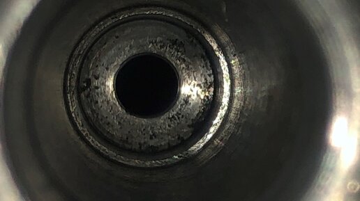 В колодце второго цилиндра пошли пузыри, подтянул болт прижима форсунки, пузыри прекратились, но не надолго. Двигатель стал троить на холодную при запуске, упала тяга. Снял форсунку , достал магнитом стальное кольцо, фторопласт опять выгорел. Весь мотор забрасывало черной жижей. Начал чистить колодец и посадочное под уплотнительное кольцо. Применяя различные приспособы и очиститель дросселя, За два дня особых успехов не добился. Колодец в итоге выглядел таким образом. Раковины, а в раковинах нагар...