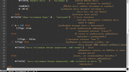 Сейчас приведем простой цикл программы с комментариями, Вы пробуете их понять, также в конце будут две ссылки на вспомогательные темы. Итак ставим задачу: зная количество человек, зашедших в лифт и массу каждого, определить есть ли превышение допустимой массы или нет. Program Lift_go; {Начало программы} Var { Раздел описания переменных} liftgo:boolean; {переменная логического типа, можно ехать или нет} num,i :integer; ...
