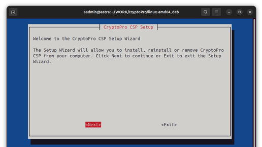 Согласно инструкции по установки КриптоПро CSP на ОС Astra Linux, необходимо распаковать скаченный с сайта https://cryptopro.ru архив. Я покажу пример установки КриптоПро CSP 5.0.11455, т.к. у нас есть лицензия для КриптоПро 4, а версия 5.0.11455 это единственная версия которая имеет графическую утилиту для управления и её можно активировать лицензией от КриптоПро версси 4. tar -xzvf linux-amd64_deb.tgz Переходим в разархивированный каталог и запускаем скрипт установки install_gui.sh с повышением привилегий...