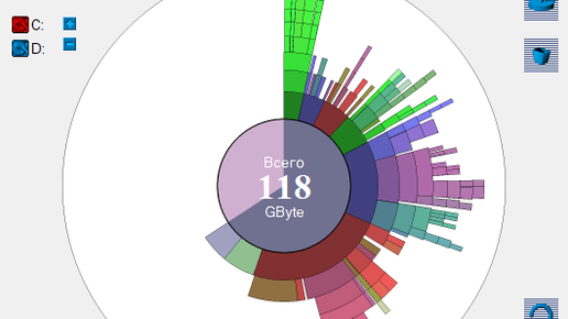 В предыдущей статье я рассказывал как очистить диск в операционной системе Windows. Сегодня расскажу о двух программах наглядно показывающих чем занято дисковое пространство. Scanner Программу разработал немецкий программист Steffen Gerlach. Scanner показывает пространство диска в виде секторальной диаграммы. Сектор - это папки или файлы с соответствующим объёмом данных. В центре - выбранный диск или несколько дисков с суммарным объёмом. Для перехода к следующему уровню папок необходимо нажать на один из секторов левой кнопкой мыши...